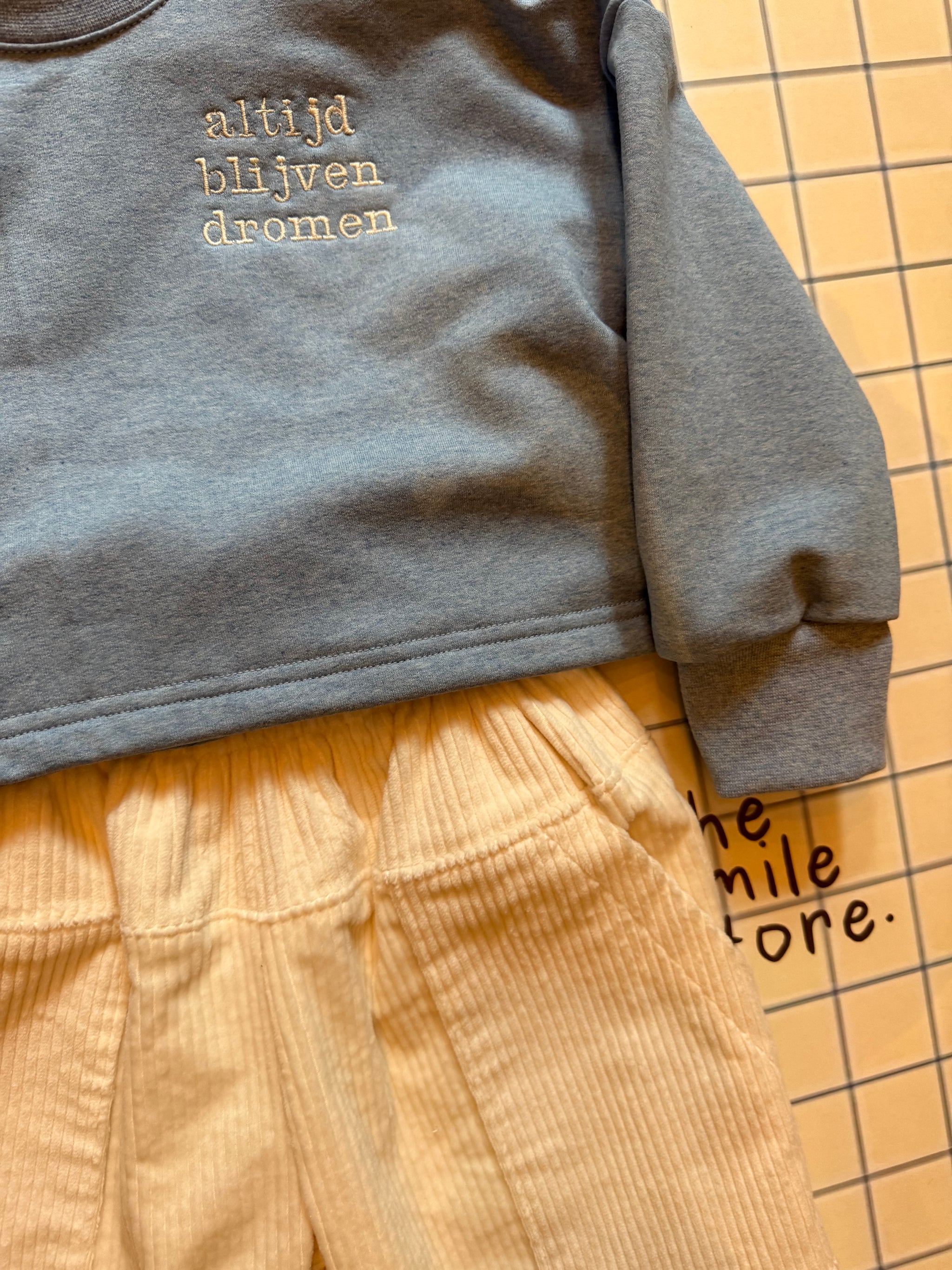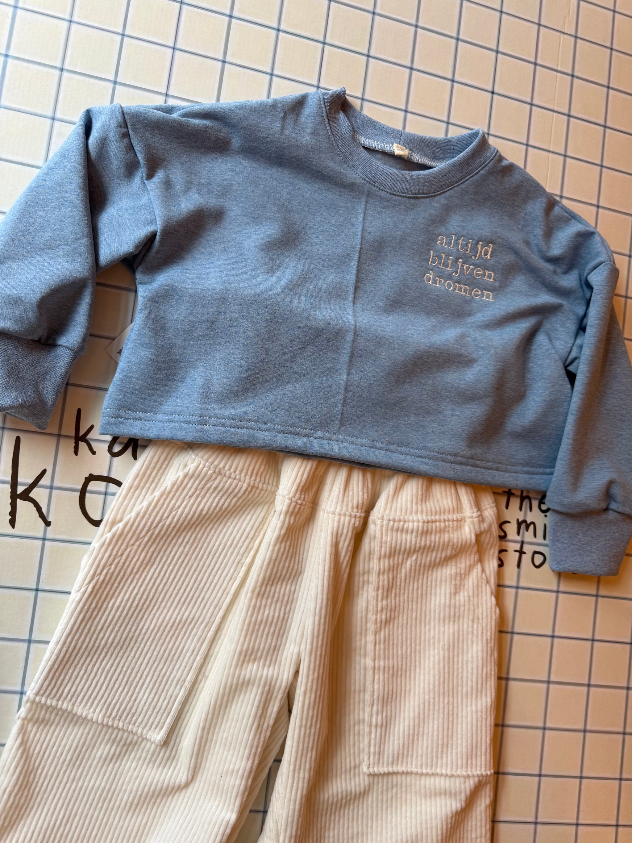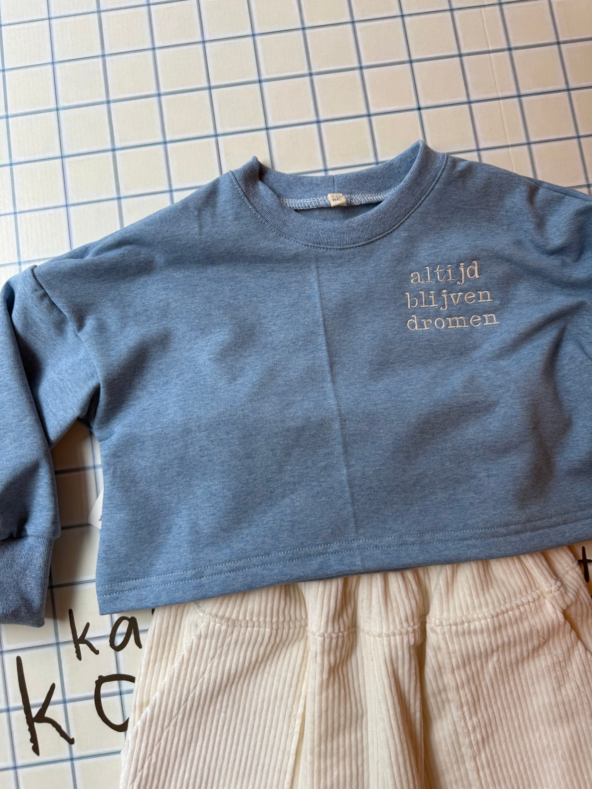 Sweater cropped - melange blauw altijd blijven dromen