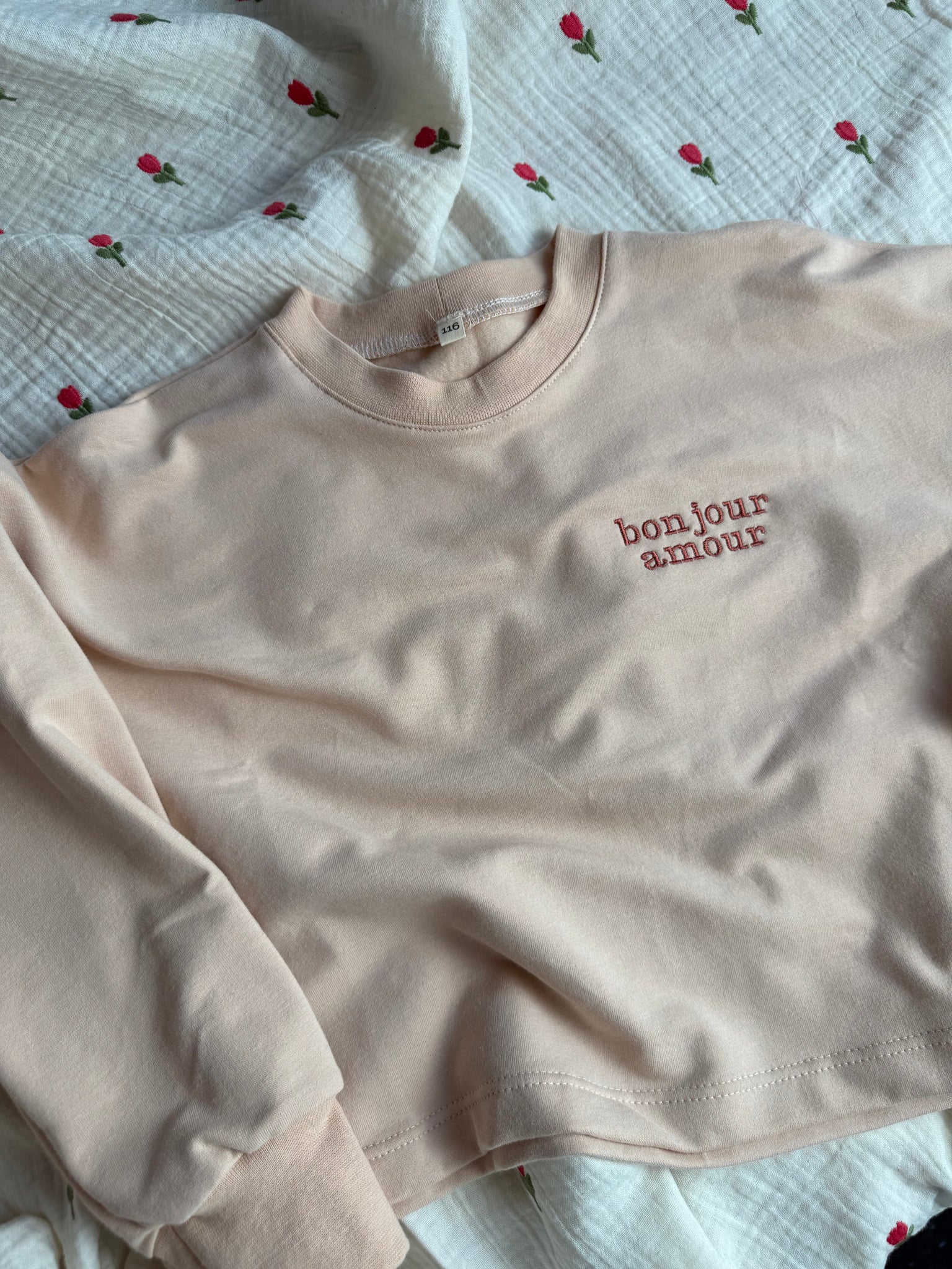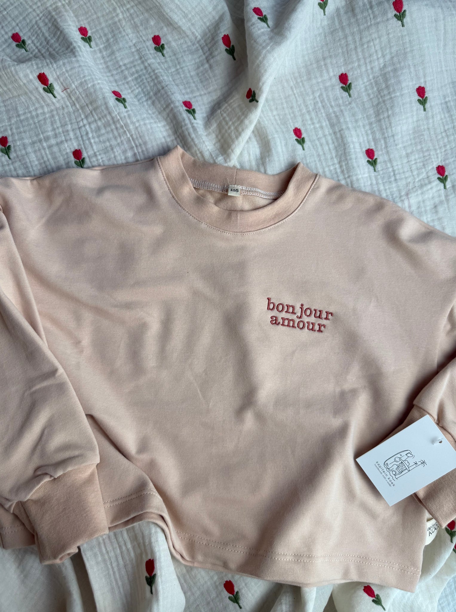 De effectieve kleur van de trui is zalm roze met wijnrood geborduurd.